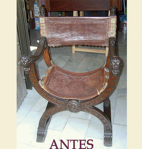en madera de nogal, con cabezas de león talladas en los reposabrazos y respaldo. Asiento y respaldo en cuero.